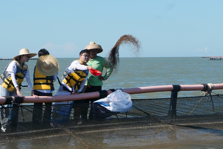 圖為隊(duì)員們體驗(yàn)投喂魚群