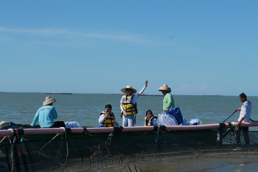 圖為隊(duì)員們乘坐快艇參觀“深海網(wǎng)箱”