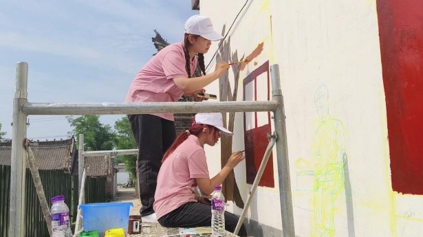 墻繪組組員勾勒線稿并填色(攝影/王亞輝)