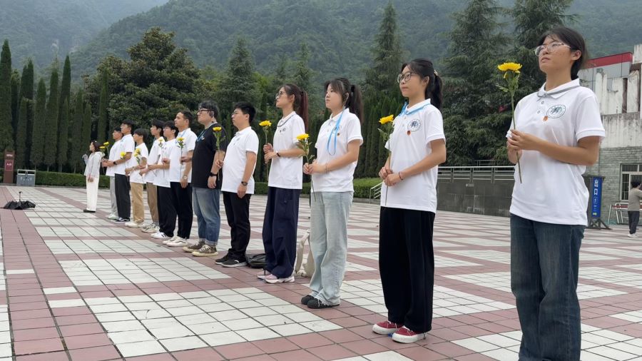 團(tuán)隊一行抵達(dá)四川汶川特大地震漩口中學(xué)遺址后映入眼簾的是映秀鎮(zhèn)的愛國主義教育基地,龐大的母親雕像令人震撼不已,其身后飄揚的紅旗更是讓人心生肅敬。在漩口中學(xué)祭奠廣場前,團(tuán)隊成員進(jìn)行祭拜儀式,全體師生手持菊花莊嚴(yán)肅立以紀(jì)念在與汶川大地震斗爭中犧牲的烈士與難民。默哀完畢,大家有序上臺在地震紀(jì)念碑下獻(xiàn)花。