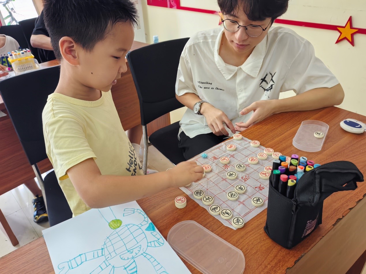為弘揚中華美育精神,響應(yīng)習(xí)近平總書記讓祖國青年一代身心都健康成長的號召。7月11日,許昌學(xué)院弘毅書院“智慧童行,暑期小課堂”社會實踐服務(wù)隊隊員在恒大綠洲社區(qū)黨群服務(wù)中心開展繪畫和中國象棋課程。