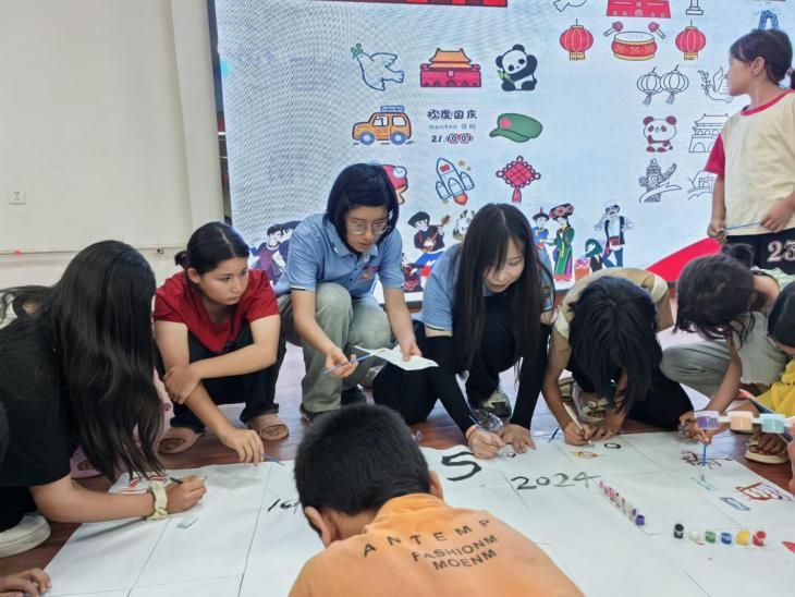 團(tuán)隊(duì)成員同小朋友一同繪制巨幅畫作 謝丹供圖