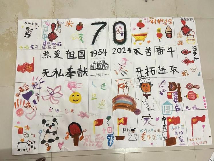 七十五載正芳華,守正創(chuàng)新鑄輝煌。自1949年新中國成立以來,我們的偉大祖國已經(jīng)走過了75年的光輝歷程。俯瞰大地,秋糧豐收在望、農(nóng)民增收可期、鄉(xiāng)村美景如畫——勤勞換來收獲;仰望天空,神舟十四號飛天、問天實(shí)驗(yàn)艙轉(zhuǎn)位、太空稻發(fā)芽生長——逐夢向著星辰。75年來,我國由一窮二白到全面小康,已踏上以中國式現(xiàn)代化全面推進(jìn)強(qiáng)國建設(shè)、民族復(fù)興偉業(yè)的新征程。大江東去,云騰浪卷。75個(gè)寒暑春秋,也是27300多個(gè)拼搏的日夜。堅(jiān)韌不拔、活力無限的中國,升騰著溫暖的煙火氣,澎湃著昂揚(yáng)的奮進(jìn)力量。小孩子們以天安門、中國結(jié)、熊貓等元素,表達(dá)對于祖國的熱愛之情。