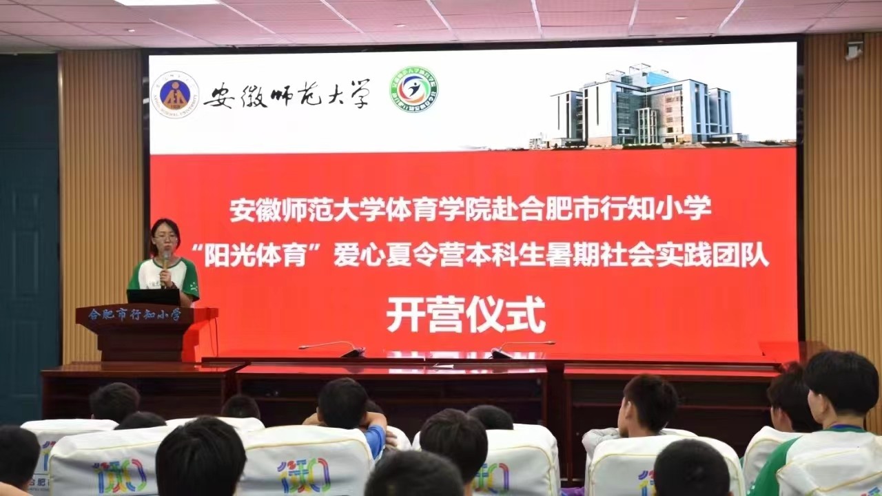 盛夏序章,以夢(mèng)為馬。為了更好地促進(jìn)本次實(shí)踐活動(dòng)的順利召開,深化體教融合,增強(qiáng)實(shí)踐隊(duì)員和學(xué)生的教學(xué)興趣,2024年7月9日,安徽師范大學(xué)體育學(xué)院赴合肥市行知小學(xué)“陽光體育”愛心夏令營本科生暑期社會(huì)實(shí)踐團(tuán)隊(duì)在合肥市行知小學(xué)(恒通校區(qū))報(bào)告大廳召開了開營儀式。