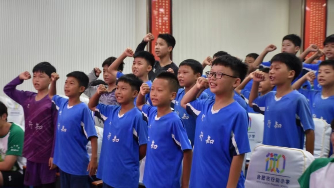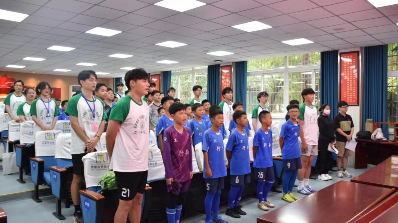 開營儀式第三項(xiàng),奏唱國歌。“全體起立!奏唱國歌!”—隨著雄渾的伴奏,清亮激越的歌聲滿溢著朝氣縈繞在大廳上空,每一個(gè)行知足球小將和實(shí)踐隊(duì)員們都滿目莊嚴(yán)、神情肅穆,帶著無限期待與自豪。眼眸中蘊(yùn)藏熠熠星輝,面視國旗,他們心中滿懷對(duì)未來的憧憬,少年的的風(fēng)發(fā)意氣在此刻展現(xiàn)得淋漓盡致。