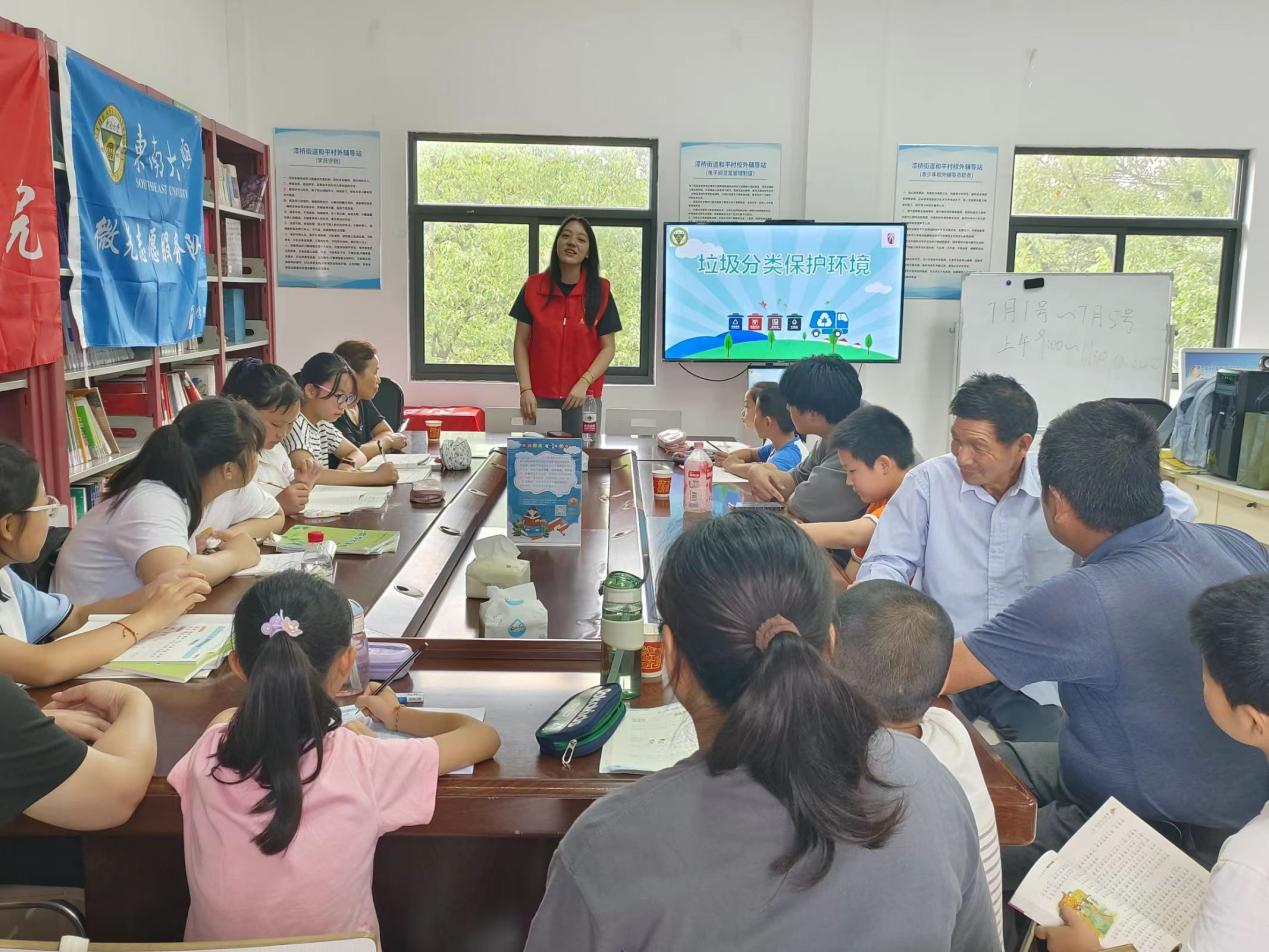 為學(xué)習貫徹習近平總書記生態(tài)文明思想,踐行綠水青山就是金山銀山的理念,響應(yīng)垃圾分類號召,增強農(nóng)村地區(qū)兒童和村民的綠色文明思想和生態(tài)環(huán)保意識,助力鄉(xiāng)村振興。2024年7月1日上午,東南大學(xué)微光志愿服務(wù)隊成員前往南京高淳區(qū)漆橋街道和平村開展垃圾分類宣講,通過垃圾分類知識講解和游戲互動激發(fā)兒童和村民熱愛自然,同時掌握科學(xué)的垃圾分類方法,助力基層鄉(xiāng)村環(huán)境治理。