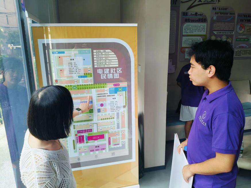 結束長樂西路街道辦事處的調(diào)研之后,實踐隊前往了電建社區(qū)進行參觀。在社區(qū)工作人員的介紹下,實踐隊對電建社區(qū)獨特的社會服務有了深入了解。