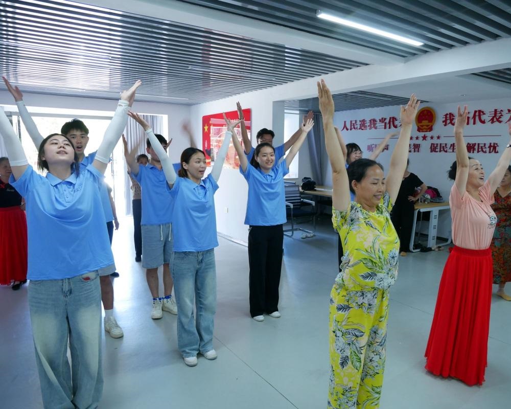歌舞聯(lián)歡情滿園,社區(qū)共融笑語喧歡聲笑語聚社區(qū),阿姨共舞歌聲揚。在社區(qū)服務中心的另一側(cè),退休阿姨們?yōu)槲璧副荣愒隈R不停蹄的進行排練,阿姨們表情到位、動作協(xié)調(diào),優(yōu)雅的表演贏得了實踐團成員們的陣陣掌聲;實踐團跟著阿姨們一同學習舞蹈動作,隨后實踐團成員黃雅如獻上個人獨舞,展現(xiàn)了當代青年人的活力。臨別之際,實踐團成員與社區(qū)阿姨共唱紅色經(jīng)典《我和我的祖國》,并合影記錄這一意義非凡的時刻。此次活動不僅加深了青老年間的情感聯(lián)系,還促進了傳統(tǒng)文化與現(xiàn)代藝術(shù)的交融共生。
