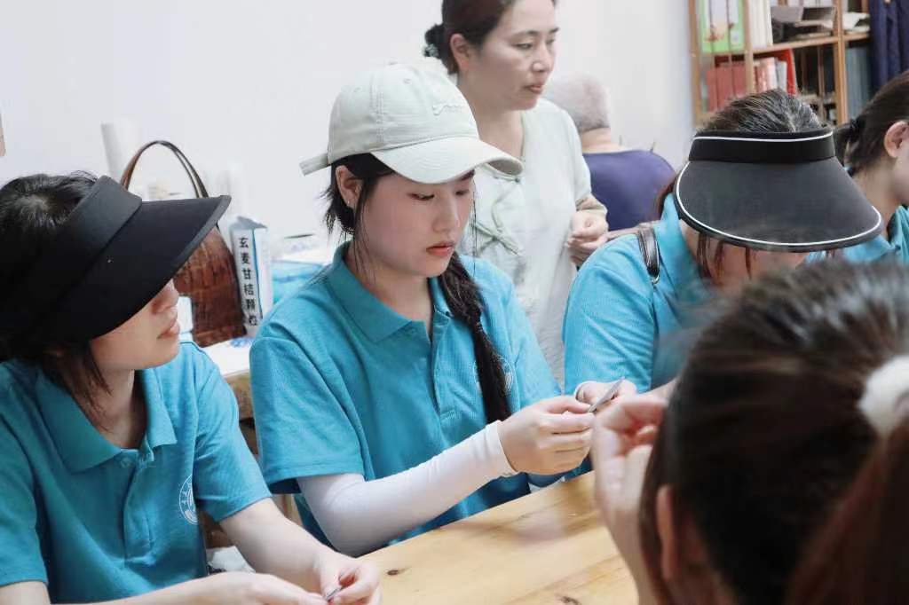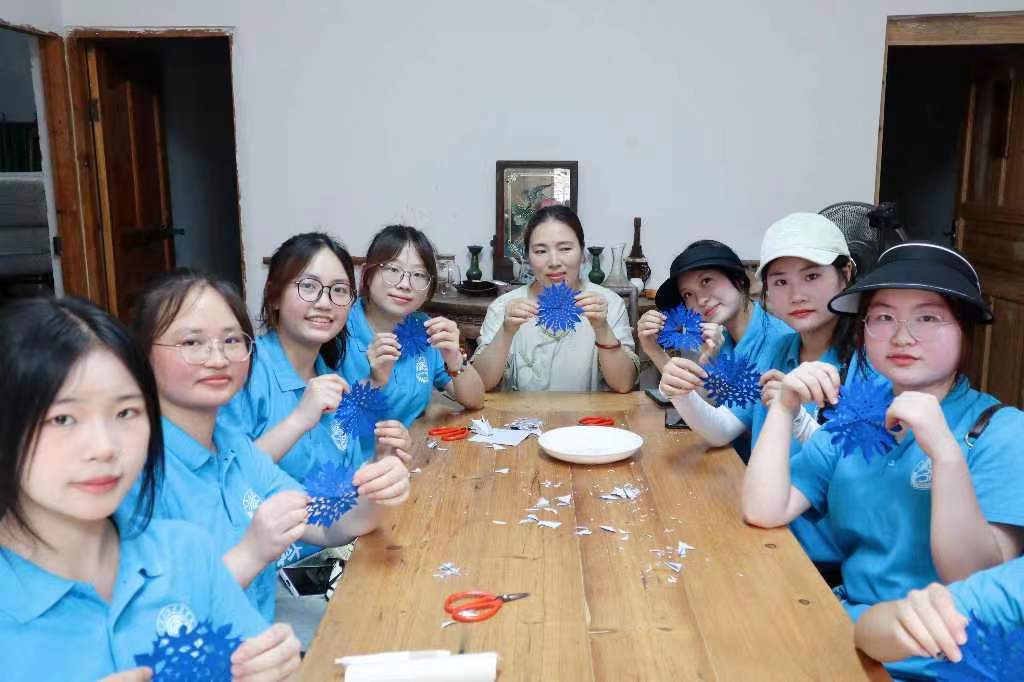 (圖為實(shí)踐團(tuán)成員跟楊老師學(xué)習(xí)剪紙)何繡潔 攝