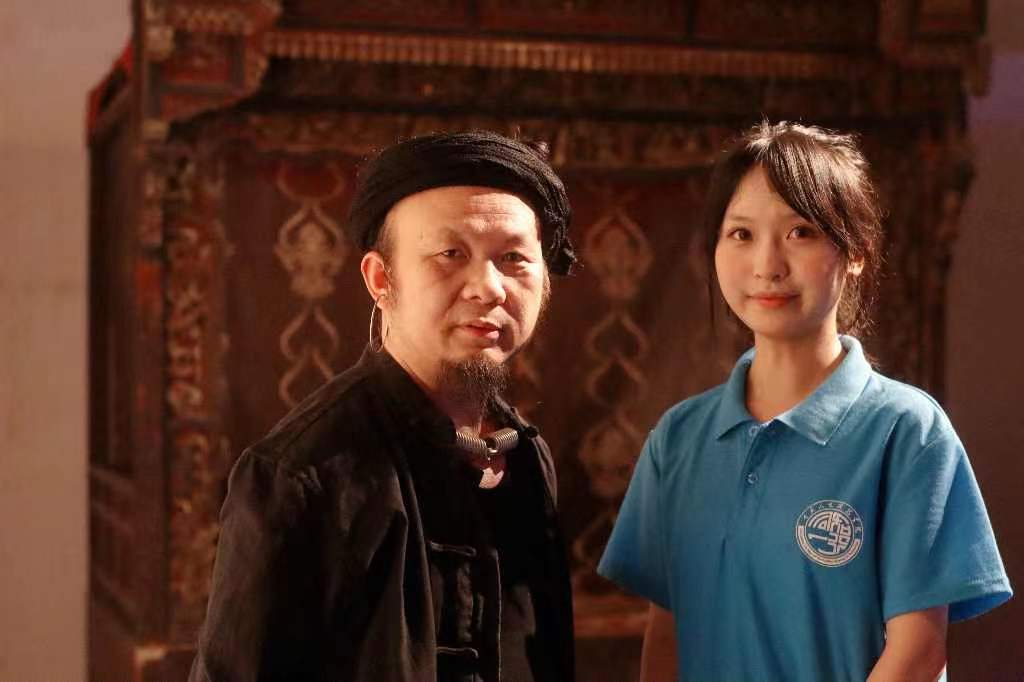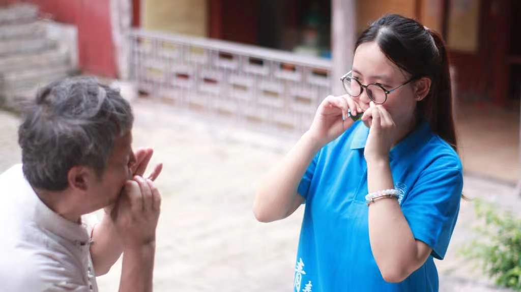 (圖為實(shí)踐團(tuán)成員采訪“吹木葉”非遺傳承人)何繡潔 攝