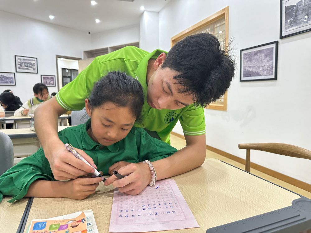 在練字訓(xùn)練的過程中,志愿者們發(fā)現(xiàn)大部分孩子們對于鋼筆的運(yùn)用較為熟練,但是大部分兒童的執(zhí)筆姿勢還存在一些不足。針對這一情況,首先,志愿者面向全體兒童講解正確握筆姿勢,先讓他們進(jìn)行自我改正,對于仍存在的一些錯誤,志愿者們則手把手教會他們掌握正確的握筆姿勢,同時糾正他們的坐姿,有效預(yù)防了他們因錯誤姿勢導(dǎo)致近視或者其他身體傷害;此外,志愿者們還進(jìn)行了筆畫的講解,書法是一門藝術(shù),其美感在于線條的流暢、結(jié)構(gòu)的均衡以及整體的和諧。筆畫訓(xùn)練能夠讓孩子們在模仿與創(chuàng)造中,逐漸形成自己的書寫風(fēng)格,為未來的學(xué)習(xí)生涯打下堅實基礎(chǔ)。