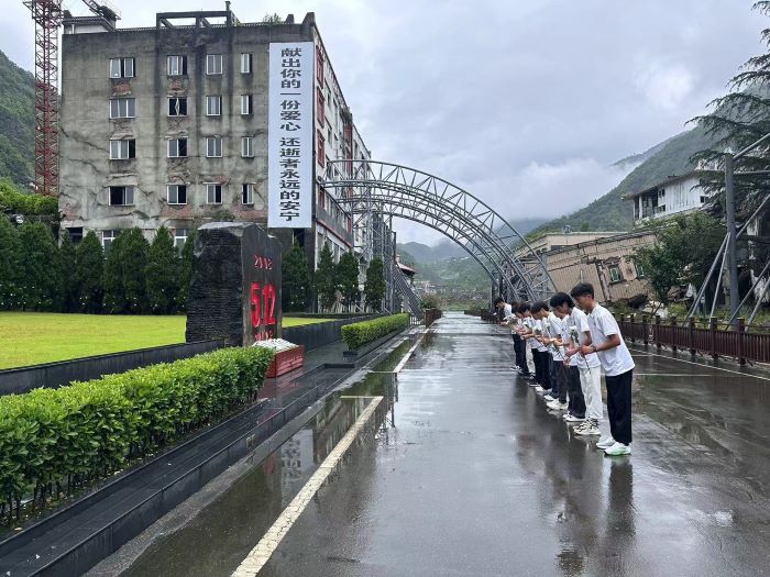 團隊全體成員在參觀前,于“5·12”汶川特大地震北川老縣城遇難者公墓前集體默哀、鞠躬,并獻上菊花,以表達對遇難同胞的深切哀悼。隨后,在講解員的引導下,團隊參觀了北川中學新校區(qū)遺址,這所本應充滿歡聲笑語的學校,在強震的摧毀下變成了一片廢墟,數(shù)百名師生長眠于此,僅存的籃球架、國旗桿及高高飄揚的五星紅旗,無不令人痛心疾首。在“5·12”汶川特大地震中,此類悲劇只是冰山一角,無數(shù)家庭遭受重創(chuàng)。