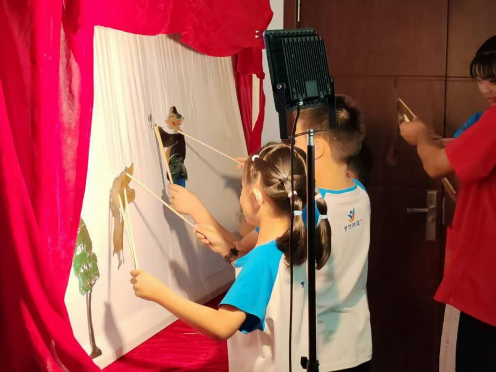 圖為孩子們上臺(tái)體驗(yàn)皮影戲表演