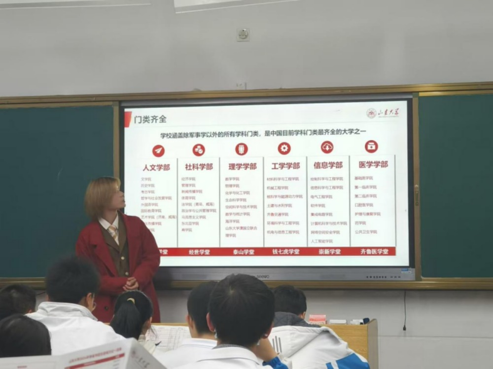 我的宣講分為五個部分:自我介紹,山東大學本科生招生政策解讀,高中學習技巧,大學生活方面分享和答疑環(huán)節(jié)。對于本次的宣講內容,原本是定在二十分鐘左右,可是在我們宣講的三個班級里面,每個班級都說了足足五十分鐘一節(jié)課。從學校的歷史到學科優(yōu)勢,再是從人才培養(yǎng)政策到學校生活方面等等,我們自豪地將山大風貌展示給同學們,將校訓“學無止境,氣有浩然”之中所蘊含的精神向同學們介紹,希望我們山大的好學風能夠沁潤到每一位學弟學妹心中。同時,我們也將自己的學習技巧分享給學弟學妹們,例如如何做筆記,如何高效聽課,希望能夠在學習方面上幫助他們。在答疑環(huán)節(jié),學弟學妹們很積極地提出自己在高中學習生活方面的疑惑,作為獎勵的學校周邊文創(chuàng)很快就發(fā)完了。