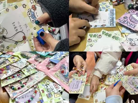 活動(dòng)伊始,工作人員們用PPT向大家介紹串珠的技巧與步驟,安排座位、分裝串珠材料,并向同學(xué)們示范串珠打結(jié)的技巧。制作過程中,大家精心設(shè)計(jì)排列圖案,并為學(xué)校女教職工寫下暖心賀卡,然后將串珠仔細(xì)包裝。