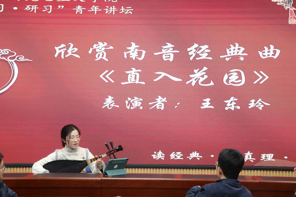 活動在中國傳統(tǒng)音樂“活化石”——南音表演中拉開序幕,福建師范大學馬克思主義學院2024級碩士研究生王東玲以一曲《直入花園》帶領大家近距離領略了國家級非物質文化遺產(chǎn)的獨特魅力。在千年雅樂的余韻中,福建師范大學馬克思主義學院2024級博士研究生余玉琦作了題為《中華文化主體性的唯物辯證法思考》主旨報告,以豐富案例分析了中華文化發(fā)展歷程中的辯證否定和對立統(tǒng)一關系,指出中華文化在普遍性和特殊性辯證關系中彰顯其自身主體性。福建師范大學馬克思主義學院2023級博士研究生張薇以《以“第二個結合”鞏固文化主體性的重要理路》為主題,從歷史溯源、理論依據(jù)、現(xiàn)實意義等多個角度,詳細剖析文化主體性的發(fā)展脈絡與豐富內涵,闡述了堅持“第二個結合”對筑牢文化根基、推動文化發(fā)展的重要作用。