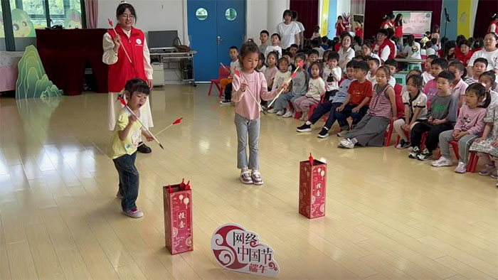 活動現(xiàn)場特別設(shè)計的文化闖關(guān)游戲?qū)夥胀葡蝽旤c。在“端午知識擂臺”上,“屈原是哪個朝代的人?”“端午節(jié)為什么要賽龍舟?”等問題剛一拋出,孩子們就爭先恐后地舉手搶答,稚嫩的聲音中透著對傳統(tǒng)文化知識的渴望。投壺競技環(huán)節(jié)更是緊張又有趣,小選手們手持竹箭,屏息凝神地瞄準(zhǔn)壺口,每當(dāng)有竹箭投入壺中,全場就會爆發(fā)出熱烈的喝彩聲。志愿者們還精心準(zhǔn)備了五彩手繩,逐一為孩子們佩戴在手腕上,鮮艷的彩繩在小手上輕輕晃動,仿佛將傳統(tǒng)文化的祝福以可觸可感的方式浸潤童心。
