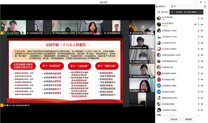 為深入學(xué)習(xí)宣傳習(xí)近平總書記重要賀信和黨中央致詞精神,貫徹落實全國學(xué)聯(lián)二十八大工作部署,2025年7月22日,生命科學(xué)學(xué)院團(tuán)委組織召開線上專題學(xué)習(xí)會。本次會議旨在引導(dǎo)團(tuán)學(xué)骨干深刻領(lǐng)會大會精神實質(zhì),凝聚青年學(xué)生思想共識,為提升學(xué)院團(tuán)學(xué)工作水平筑牢思想根基。會議由院學(xué)生會執(zhí)行主席黃錦坤主持,八十余名學(xué)生骨干參與了此次學(xué)習(xí)。