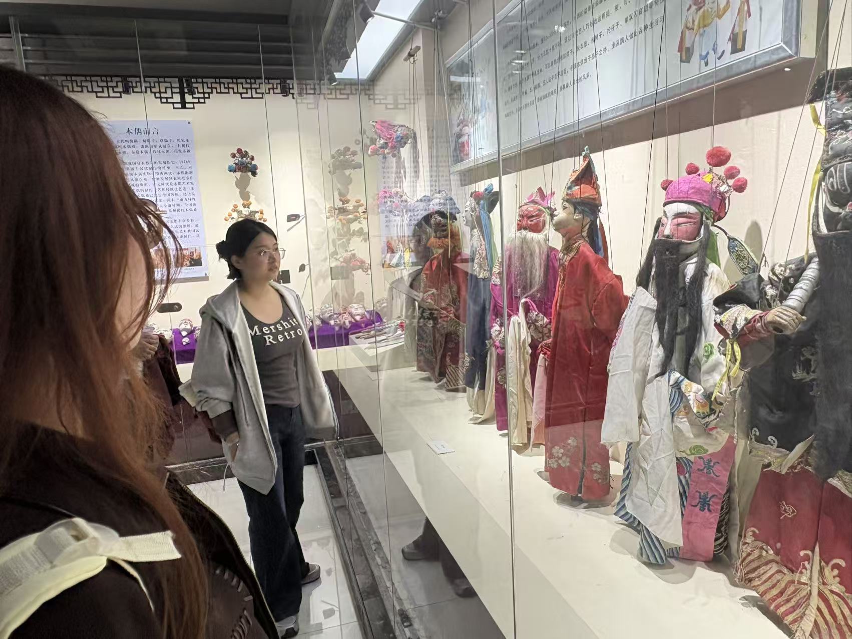 在陜西秦腔博物館,同學(xué)們通過實物展陳、圖文資料和多媒體展示,系統(tǒng)了解秦腔的歷史淵源、藝術(shù)特色與發(fā)展脈絡(luò)。重點觀摩了傳統(tǒng)木偶戲道具、經(jīng)典劇目服飾、臉譜工藝以及相關(guān)碑刻書法作品,深入了解秦腔作為國家級非物質(zhì)文化遺產(chǎn)所承載的藝術(shù)價值與人文精神。通過現(xiàn)場學(xué)習(xí),同學(xué)們對秦腔在文學(xué)、音樂、美術(shù)與民俗等多領(lǐng)域的融合性特征有了更為全面的認識,進一步提升了對傳統(tǒng)戲曲文化的理論素養(yǎng)。